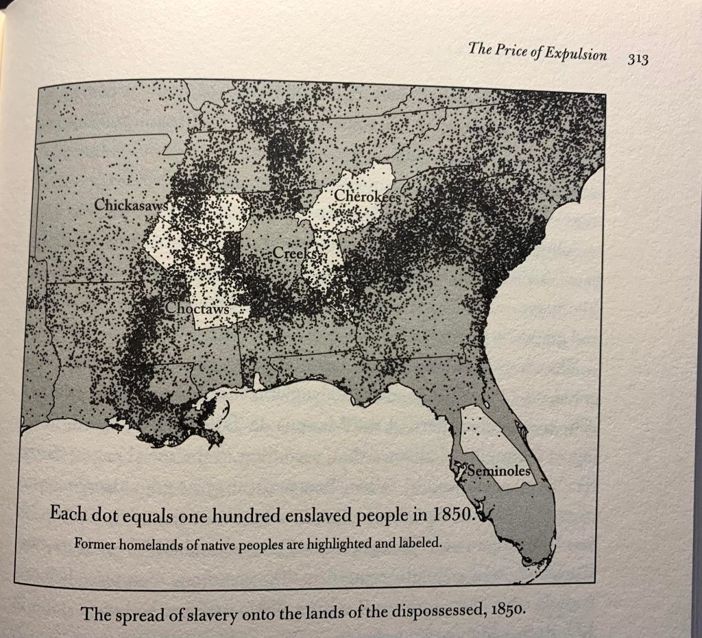 These maps, showing how plantation slavery grew like a cloud of locusts over native lands, make it clear how central economic theft was to the entire endeavor. Like Edward Baptist and other contemporary historians, Saunt goes to considerable lengths to estimate just how much wealth, in land and in other ways, was expropriated. Of course, an overt white supremacist ideology was invoked to justify the acts. As the maps above indicate, neither Cherokee nor Seminole territory was all that valuable for purposes of plantation slavery—the first was hilly, the latter swampy. But Indians, like blacks, slave and free, were not white—and had no standing.